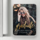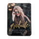 Anúncio de formatura magnético moderno com uma foto vertical personalizada. A palavra "graduate" aparece em letra dourada em imitação de folha metálica, com o nome do formando, escola e ano de graduação abaixo em fonte branca sem serifa. Substitua facilmente a imagem de amostra pela foto do seu formando. Uma tela preta com gradiente ajuda a garantir que o texto se destaque. Ideal para formatura do ensino médio ou faculdade.