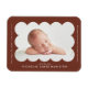 Ímã de anúncio de nascimento moderno com a foto do seu bebê aninhada dentro de uma moldura ondulada marrom. Personalize o ímã de anúncio de nascimento marrom adicionando o nome do seu bebê e informações adicionais em letras brancas.