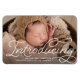 Anuncie a chegada do seu bebê com estes cartões de nascimento modernos. Use este modelo fácil de usar, personalize este cartão magnético com a foto do seu recém-nascido, data de nascimento, peso e comprimento. Ser um cartão magnético é uma maneira fácil de a família e os amigos exibirem e apreciarem esse momento especial. A palavra 'Introdução' usa uma fonte moderna de estilo caligráfico. Bonita, elegante e na moda. Nota: Uma camada preta foi adicionada sob o texto para ajudar as palavras a se destacarem contra a foto que você usa.
