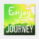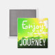 Este ímã mostra uma fotografia tirada das montanhas no Parque Nacional Glacier, em Montana, editada para um céu amarelo colorido. O imã tem as palavras "Aproveite a Viagem!"