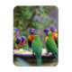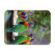 Grupo de aves exóticas coloridas reunido em torno de uma mesa de alimentação.