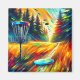 Abstrato de golfe colorida, o temido ai artl Bird voando no céu, pinheiros altos, cores do outono e discos voando em toda parte em direção a um pino de golfe de disco.