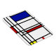 Mondrian Modern Art tem uma seção como Composição 10 de Pieter Piet Mondrian em vermelho, azul, amarelo, preto e branco, o mais conhecido grupo de arte De Stijl que usou três cores primárias com linhas pretas em um fundo branco