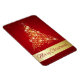 Ilustração de Natal moderna, elegante e festiva, com uma árvore de Natal feita de estrelas brilhantes sobre fundo vermelho com flocos de neve e ouro.