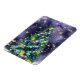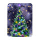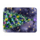 Ilustração aquosa de uma colorida árvore de Natal na neve em uma noite fria de inverno com céu estrelado brilhante.