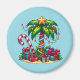 Magnet com imagem de feriado sazonal. Uma palmeira tropical decorada em luzes festivas com uma estrela no topo. Uma bengala branca e vermelha gigante que sai da areia. Presentes de Natal debaixo da árvore. Whimsical e divertido.