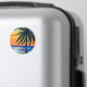 As cores da safra azul e laranja da palmeira da silhueta e as ondas oceânicas numa praia arenosa geraram trabalho de arte.
