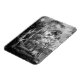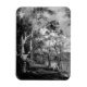 Um design fotográfico preto e branco de árvores de outono, caminho e lago.