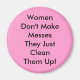 As Mulheres Não Fazem Messes é um produto de declaração humorístico. Isto põe em evidência o fato de que as mulheres não devem ter de limpar a bagunça dos outros. Infelizmente, muitas mulheres podem ainda estar relacionadas com o fato de muitas vezes serem deixadas a limpar-se depois de outras. Se você é uma daquelas mulheres que podem se relacionar com isso, então você pode apreciar o humor nesta declaração.