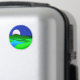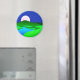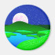 Magnet em ilustração circular de uma ascensão de lua de cheio sobre colinas verdes por uma margem do lago, com um céu azul estrelado à meia-noite