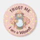 Um velho feiticeiro com capa rosa olhando para a bola mágica de cristal.