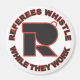 Os árbitros assobiam mesmo enquanto trabalham. Logotipo da letra R do Refere com forma de assobio. Personalize com um nome e/ou número ou um fundo de cor diferente, se preferir, clicando em "Personalizar este design".