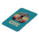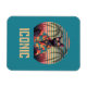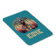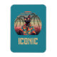 Eterno Tropical Cat Attitude Magnet: Um gato preto, vestindo óculos de sol de tamanho excessivo e uma camisa havaiana, atingindo uma pose legal com um pôr do sol tropical atrás dela.