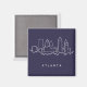 Esta design apresenta um desenho desenhado manualmente da linha do horizonte Atlanta em um fundo roxo.