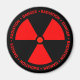 Perigo - Radiação - letras vermelhas e símbolo de radiação com fundo preto.