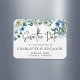 Flores brancas e cheias de pedras e folhas verdes de aquarela formam uma bela borda neste bonito floral azul Guarde o Cartão de Data para um casamento na primavera. Um escaneado moderno e manuscrito lê SALVAR A DATA acima dos nomes dos casais.