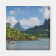 Fotografia de Souvenir da Baía de Cook tropical com um fundo de barco e vulcão com palmeiras e selva na ilha de Moorea, perto do Tahiti, no arquipélago pacífico Polinésia Francesa.