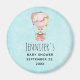 Ímã de salvar data de evento com um design adorável apresentando uma ilustração em aquarela. Um balão de ar quente decorado com lindas flores vermelhas e rosadas. Um ursinho branco bebê fofo sentado na cesta. Fundo azul claro.