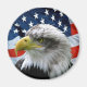 Um imã patriótico com uma bela foto de perto de Bald Eagle em frente à bandeira americana.