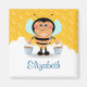 Um bonitinho trabalhador de desenho animado tropeça de abelha carregando um balde de mel em cada mão. Ele tem um grande sorriso no rosto e bochechas rosadas brilhantes. Personalize com um nome.