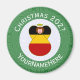 Íman redondo para decoração de Natal com um anjo vestido na bandeira da Alemanha. O anjo de Natal alemão encontra-se dentro um círculo branco de quadrados rabugentos com um fundo de quadrados verdes. Adicione seu próprio texto, se desejar. Personalize com um nome e personalize com o ano. Coisa divertida. Honre sua herança alemã durante o feriado.