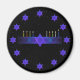 Uma imagem fractal roxa e azul, com um Magen David (Estrela de David), no meio, como uma menorah Chanukkah. O motivo é repetido como limite de 12 estrelas. As velas estão acesas.