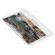 Imagem fotográfica de souvenir com barcos de pesca na água do porto da cidade costeira Castellammare del Golfo perto de Scopello e Palermo em Trapani, Sicília, Itália, com o texto "Sicília, Itália" numa caixa branca e com faixas em verde, branco e vermelho, as cores da bandeira italiana.