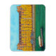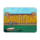 Pintura colorida e estilizada do majestoso edifício Kaserne (ex-militar suíço) de Basileia, ao longo do Reno, com uma colorida fortaleza de outono, e da pequena fada do Reno Vogel Gryff que atravessa o Reno de Grossbasel a Kleinbasel, num ímã da artista popular Lisa Lorenz