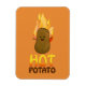 Um desenho animado de batata marrom com um sorriso grande e feliz, pontos para os olhos e paus para os braços. Ele está rodeado de chamas amarelas e cor de laranja queimadas. Abaixo dele, em texto laranja e amarelo, encontra-se a palavra HOT e abaixo dela, em texto castanho, está a palavra POTATO. Diversão de design para rir.
