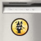 Este imã assustador do Dia das Bruxas fará uma decoração de excelente para o seu entretenimento e decoração de casa no Halloween em outubro. Ele apresenta uma velha e assombrada silhueta de casas com uma lua de cheio amarela gigante e assustadora atrás dela. Há também um bando assustador de morcegos negros voando ao seu redor.