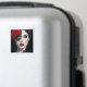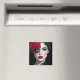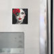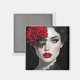 Magnet with a beautiful black and white illustration of a pretty woman with a red rose and red lipstick.
