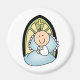 Um menino vestindo um vestido azul se posiciona contra uma janela da igreja com uma cruz em itens de bebês design do batismo que você pode personalizar no local com um nome ou outro texto.