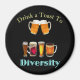 Um design de bebedouros divertidos com duas canecas levantadas com o texto "Beba um brinde a" e abaixo de uma coleção diversificada de diferentes copos de cerveja e a palavra "Diversidade".