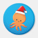 Um polvo de cartoon laranja giro com chapéu de Papai noel. Fundo azul. Ímanes de animais bebês. Ideia de presente para crianças.