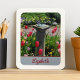 Um belo jardim florístico, este ímã apresenta bonito flores rosa, lilás e amarelas ao redor de uma linda estátua. Personalize seu nome na parte inferior. Escolha o seu hoje!