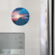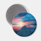 Magneta com uma bela fotografia. Um lugar cênico. Um lago tranquilo com uma doca de madeira que se estende para fora. Definir o sol fornece lindas cores no céu, vermelho e azul vibrantes.