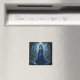 Uma bela fada vestindo um vestido azul escuro e um colar feito de safiras com safiras em seus longos cabelos azuis escuros e asas translúcidas como a libélula, segurando um povoado de montanha russa em uma lagoa rasa em uma floresta mágica cercada por torres, cogumelos de laranja e árvores cobertas de cipós, flores e cogumelos.
