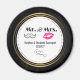 Um imã de casamento com um design de casamento de estilo moderno - lábios de kissy cor-de-rosa glamourosos e uma ilustração de bigode retrógrada masculina. Colocado sobre um fundo de quadro negro com um quadro circular de gradiente dourado no centro. O texto diz que o Sr. e a Sra. podem personalizar com seus nomes e data de casamento.