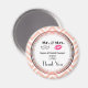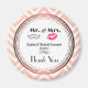 Um ímã de agradecimento com um design de casamento moderno - lábios cor-de-rosa glamourosos e uma ilustração de bigode masculino com visual retrô. Definido em um fundo de chevron cor de pêssego com um círculo sobreposto. O círculo tem uma borda com gradiente de rosa dourado. O texto interno diz Sr. e Sra. e você pode personalizar com seus nomes e data de casamento.