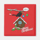 Uma ilustração de uma casa de pássaros com decorações natalinas de amoras sagradas e bolas penduradas onde um Blackbird está cantando alegremente e deseja um Feliz Natal. O teto está coberto de neve. Esta design é feita para comemoração de férias de inverno e amantes de aves.