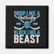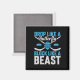 Magneta de Hockey Goalie com texto azul e branco, capacete com máscara, punhos e bastões de hóquei lê Largar como um Bloco de Borboleta Como uma Besta!