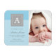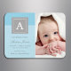 Um anúncio de nascimento por foto simples e sofisticado exibe um inicial de monograma serif ousado em um bloco cinza platina em um fundo azul céu brilhante. Um cabeçalho "Apresentamos" com o nome em letra cursiva e as estatísticas de nascimento fica ao lado de uma foto paisagem. Uma mensagem dos pais "Com Amor" adiciona um toque final caloroso. Todas as cores e textos são totalmente personalizáveis.