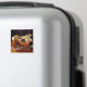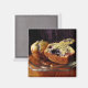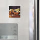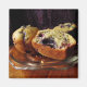 Este ímã apresenta muffins de mirtilo, regados pela boca, dispostos em uma placa de vidro brilhante em uma mesa de madeira. O fundo está mergulhado em um profundo tecido roxo.