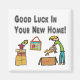 Boa Sorte no seu novo design de Casa apresenta um movimentador feliz desembalando um gato com outras caixas, uma flor e uma imagem maravilhosa no fundo. Uma imagem alegre para qualquer um que mude de casa e que comece uma nova casa.