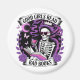 Um design vibrante e colorido mostra um esqueleto feminino lendo um livro enquanto bebe um coquetel furado. Ao redor dela estão flores roxas e borboletas, somando-se a estética viva. O texto ousado e colorido diz: "As boas meninas leem livros ruins." Esse design exclusivo está disponível em uma grande variedade de produtos.