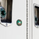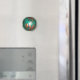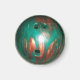 Fotografia de uma bola de boliche verde e laranja com orifícios dedos e polegares mostrando e imprimindo nas bordas do ímã.