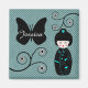 Presentes personalizados e acessórios com uma boneca japonesa fofa em kimono vestidos contra fundo azul e bolinhas preta e árvore oriental do ornamentado e padrão vegetal.