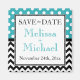 Imã salve o dia na moda personalizados para anunciar seu casamento, projetados com bolinhas brancas sobre turquesa no topo e um padrão de zigue preto e branco no fundo.