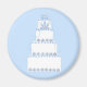 Um elegante bolo de noiva de quatro camadas em branco com sotaques azuis. Uma bonito sombra de azul para o fundo.