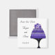 Bonito bolo roxo em camadas com flores e folhas verdes e suaves em cima, fitas pretas que caem sobre um suporte de bolo preto. . Personalize com todas as suas informações conforme desejado.